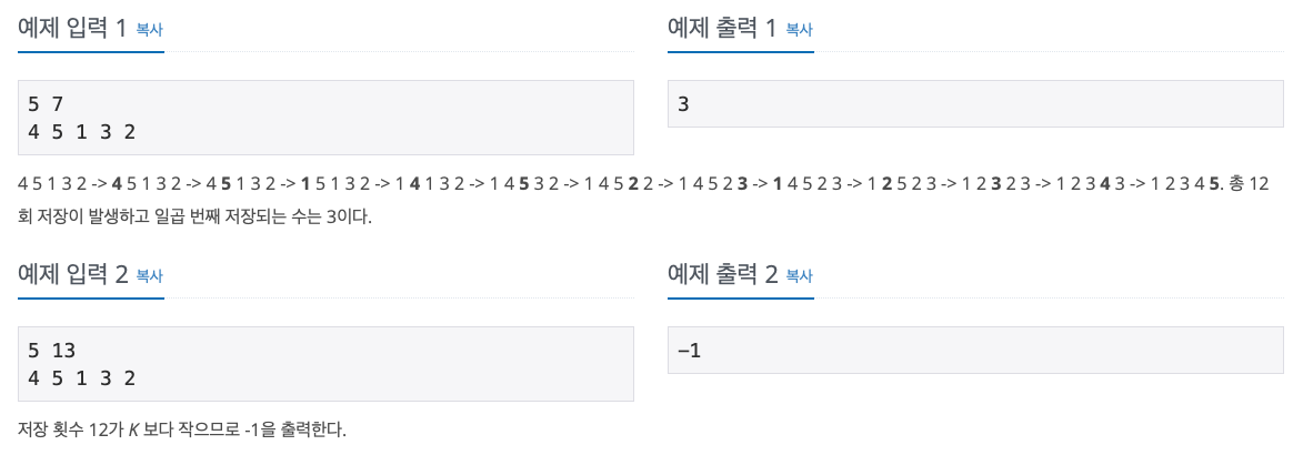4. 만약 K의 값이 저장 횟수보다 크다면, 현실에서 존재할 수 없는 저장 횟수이기에 -1을 출력해준다.