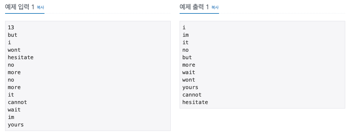 첫째 줄에 단어의 개수 N이 주어진다. (1 ≤ N ≤ 20,000) 둘째 줄부터 N개의 줄에 걸쳐 알파벳 소문자로 이루어진 단어가 한 줄에 하나씩 주어진다. 주어지는 문자열의 길이는 50을 넘지 않는다.