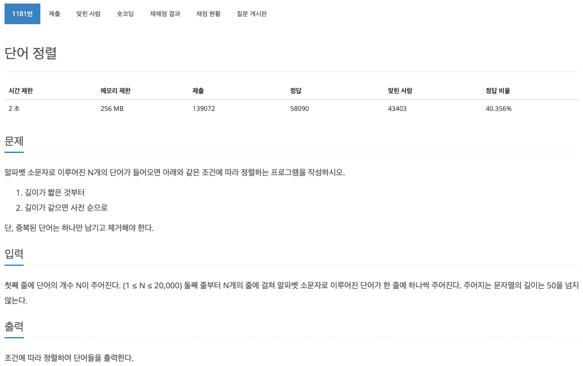 - 길이가 짧은 것 순으로 정렬하고, 길이가 같을 겨우에는 사전 순으로 정렬한다.