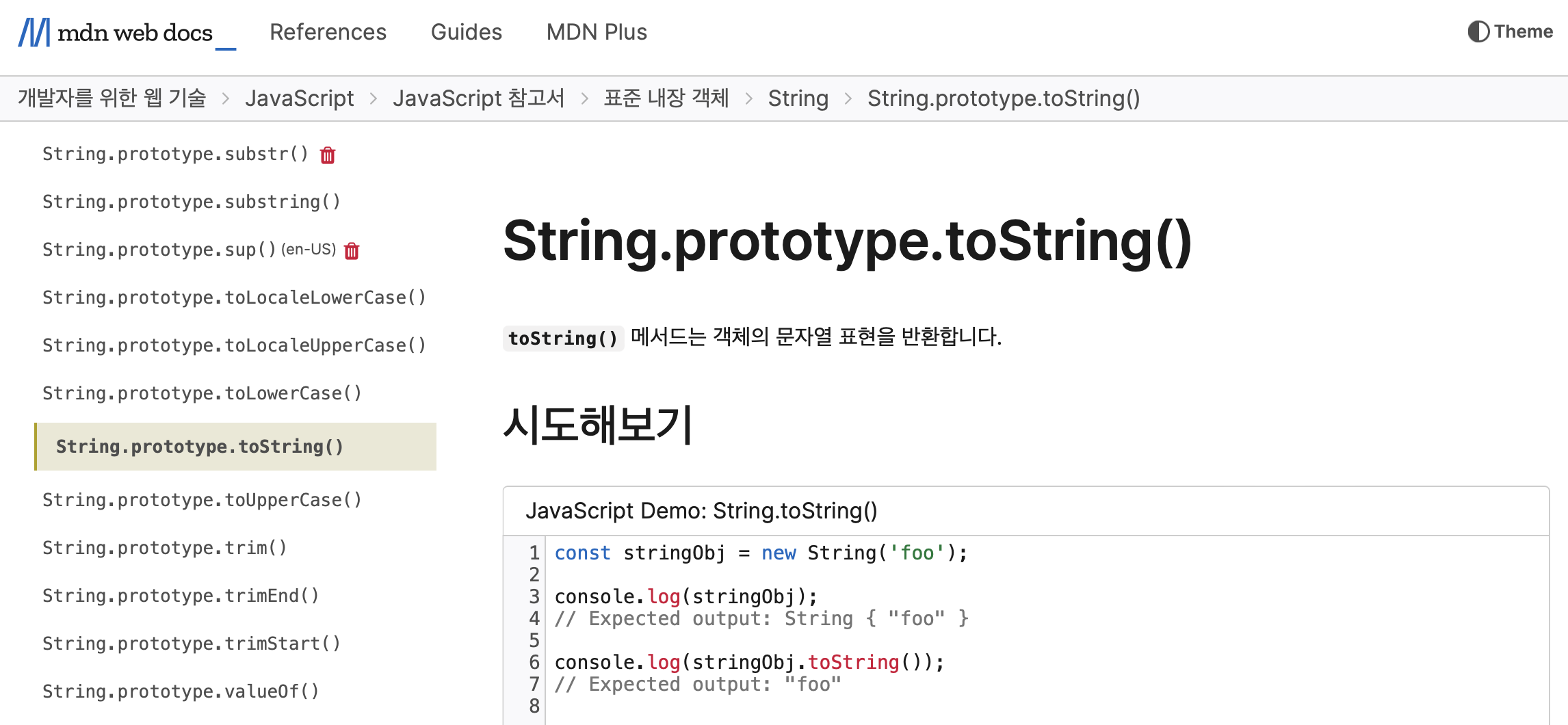 MDN을 살펴봐도 String의 프로토타입 내에 메서드가 있는 것을 알 수 있다.