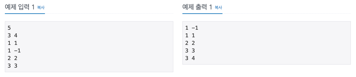 - 좌표를 x값이 증가하는 순으로 정렬하고, x값이 같을 경우 y값이 증가하는 순으로 정렬한다.