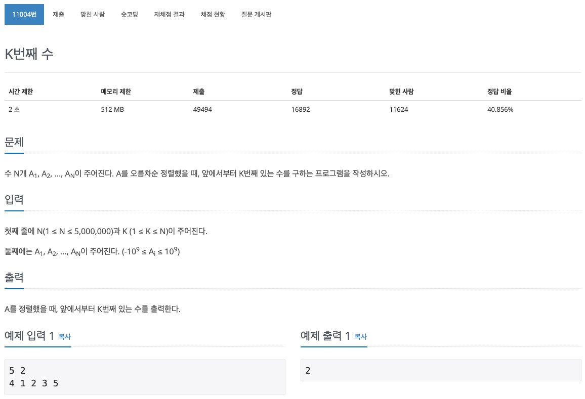 - N개의 정수를 오름차순으로 정렬했을 때, K번째 수를 출력해준다.