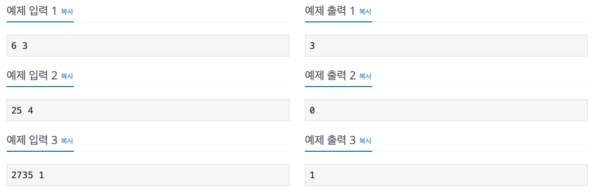 - 자연수 N의 약수 중 K번째로 작은 약수를 구해 출력해준다.