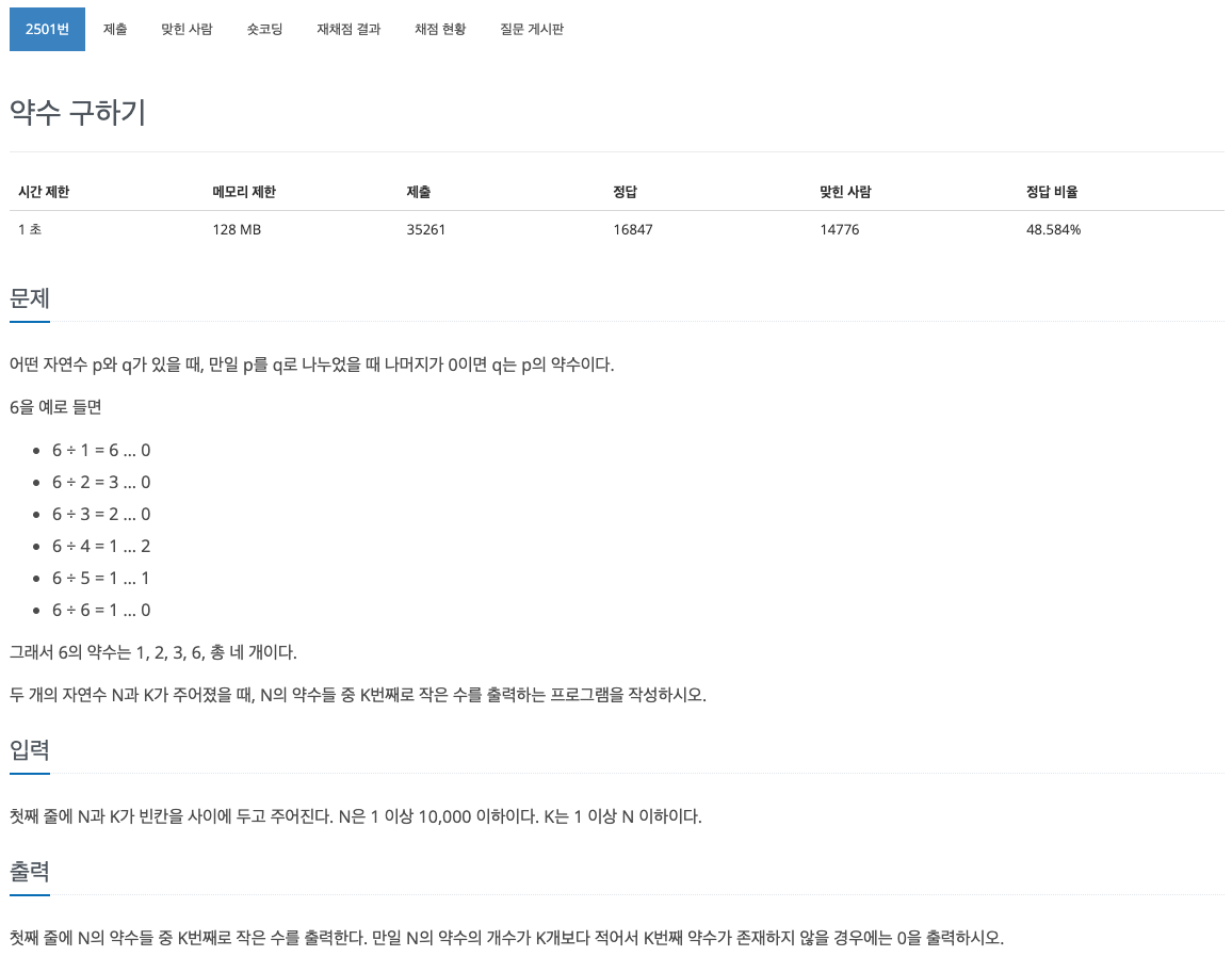 - 자연수 N의 약수 중 K번째로 작은 약수를 구해 출력해준다.