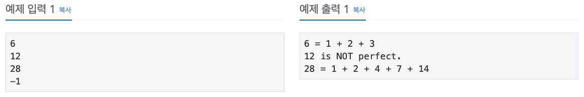 이 문제에서는 완전수인지 판단해야 할 수가 줄바꿈을 기준으로 주어지고, 맨 마지막에는 -1이 주어진다.
