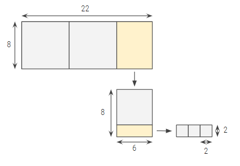 즉, 맨 마지막에 나머지 2는 그 위의 나머지 사각형인 6의 최대공약수이기도 하고, 또 그 위의 나머지 사각형인 8의 최대공약수이며, 최상위 사각형인 22의 최대공약수이기도 한 것이다.