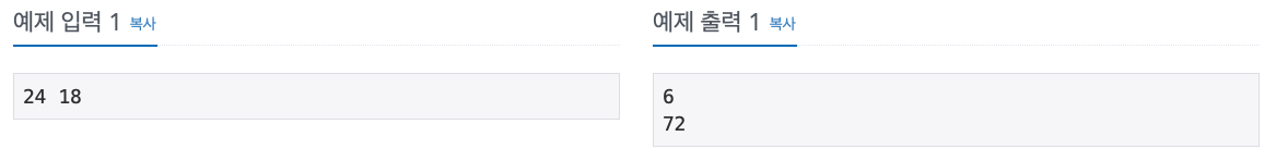 첫째 줄에는 입력으로 주어진 두 수의 최대공약수를, 둘째 줄에는 입력으로 주어진 두 수의 최소 공배수를 출력한다.