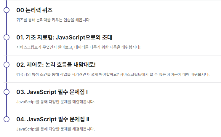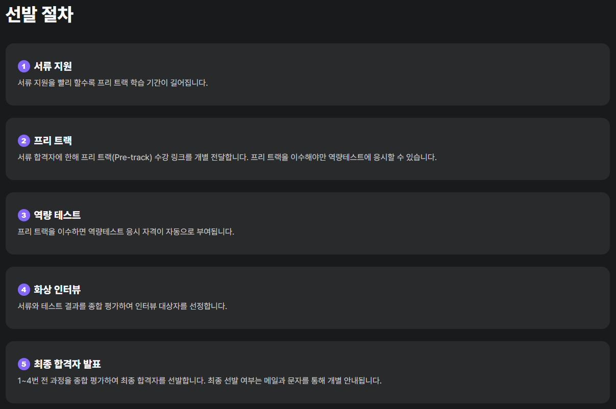 서류에 빨리 합격한다면 "프리 트랙(pre-track)"을 수강할 수 있는 기간이 늘어나기 때문이다. 프리 트랙에서는 논리력 퀴즈와 자바스크립트(JavaScript)의 기초 내용, 연습 문제들로 구성되어 있고, 이것만 수강해도 비전공자가 기초를 다지는 데 큰 도움이 된다.