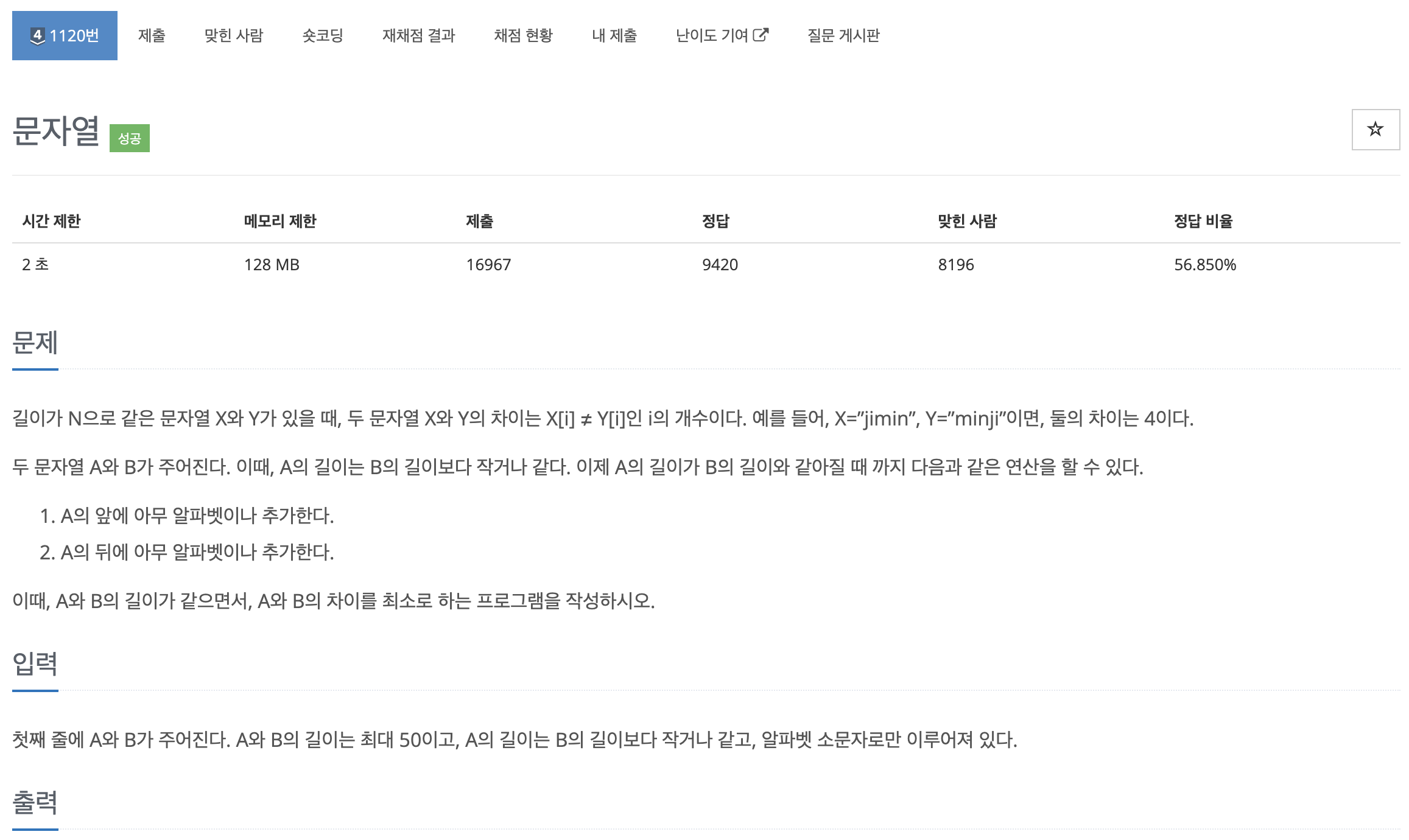 [BOJ] 1120번 : 문자열 (브루트포스) 본문