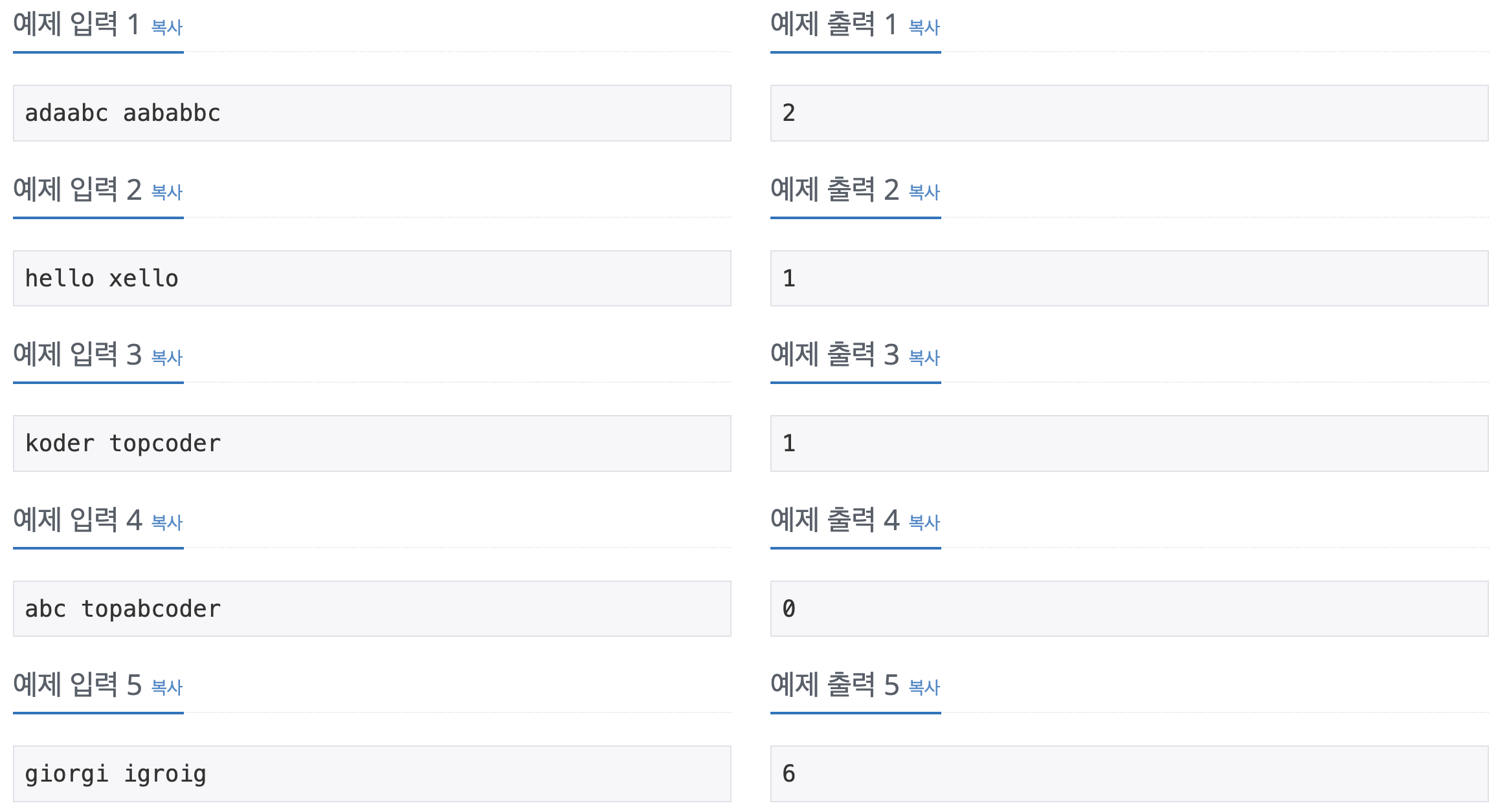 - 예를 들어, ab와 abc가 주어질때, 1~2번째 문자끼리 비교하면 ab와 ab를 비교하는 것이므로 차이 개수는 0개다