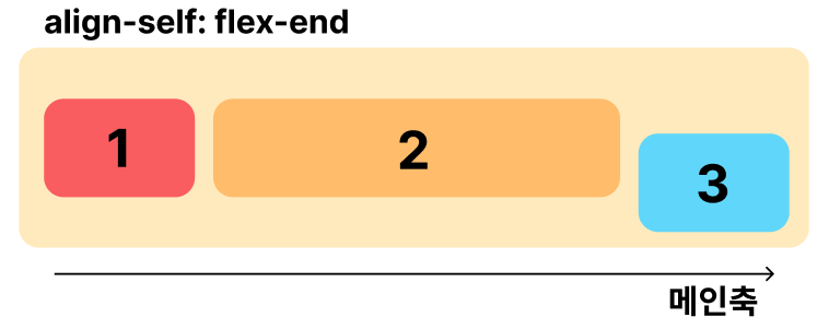 align-self 는 교차축에서 개별 item을 정렬하는 속성이다. align-items는 모든 item의 배치를 동시에 적용했다면, align-self는 필요에 따라 개별 item의 배치를 조정할 수 있다.