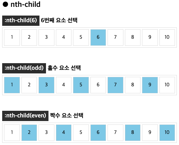 - :nth-child(n) - 앞에서 n번째 요소를 선택