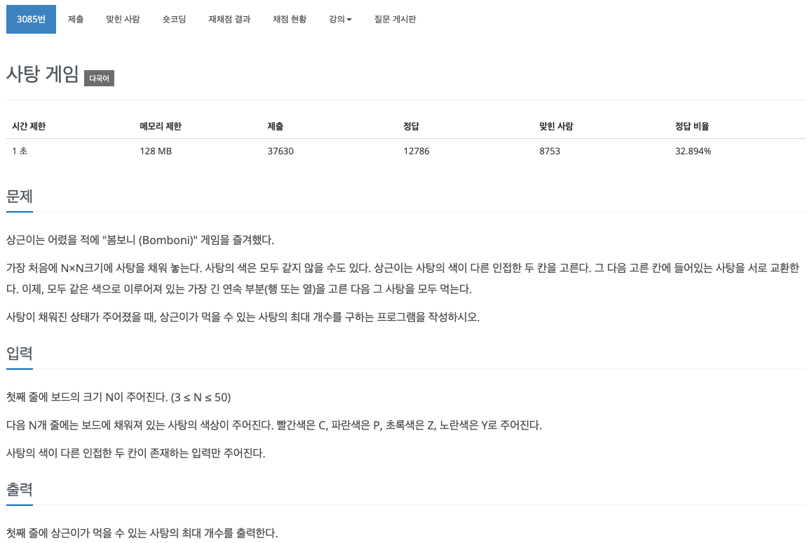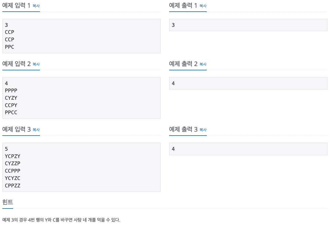 이 문제에서는 1번째 줄에 N이 주어지고, 그 다음줄부터는 가로 N, 세로N 길이의 사탕이 주어진다. 사탕의 종류는 빨간색 C, 파란색 P, 초록색 Z, 노란색 Y로 구성되어 있다.