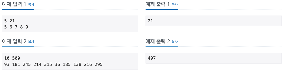 이 문제에서는 1번째 줄에 카드 개수 N과 M이 공백을 기준으로 주어진다. 그 다음줄에는 N개의 카드가 공백을 기준으로 주어진다.