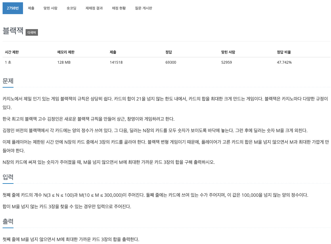 - 이 3장의 합이 M 이하면서 M에 최대한 가까울 때, 이때의 합을 출력해준다.
