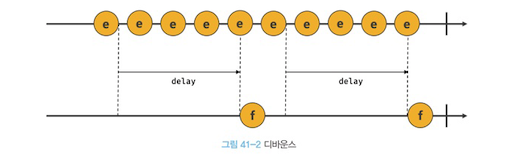 - 짧은 시간 간격으로 발생하는 이벤트를 그룹화하여 일정 시간 간격으로 이벤트 핸들러가 호출되도록 하는 기법