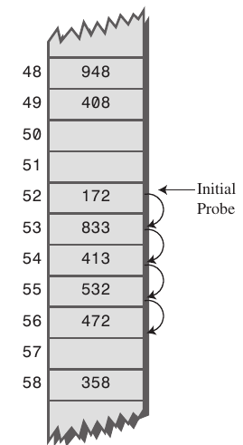 구현이 간단하지만 primary clustring 문제에 취약하다는 단점이 있다. 아래의 사진을 보면, 최초 충돌이 발생한 bucket 주변에 데이터들이 저장되게 된다. 즉, 데이터의 균등한 분포를 방해할 뿐만 아니라, 선형 탐색 시간을 증가시키고, 캐시 효율성을 떨어트릴 수 있다.