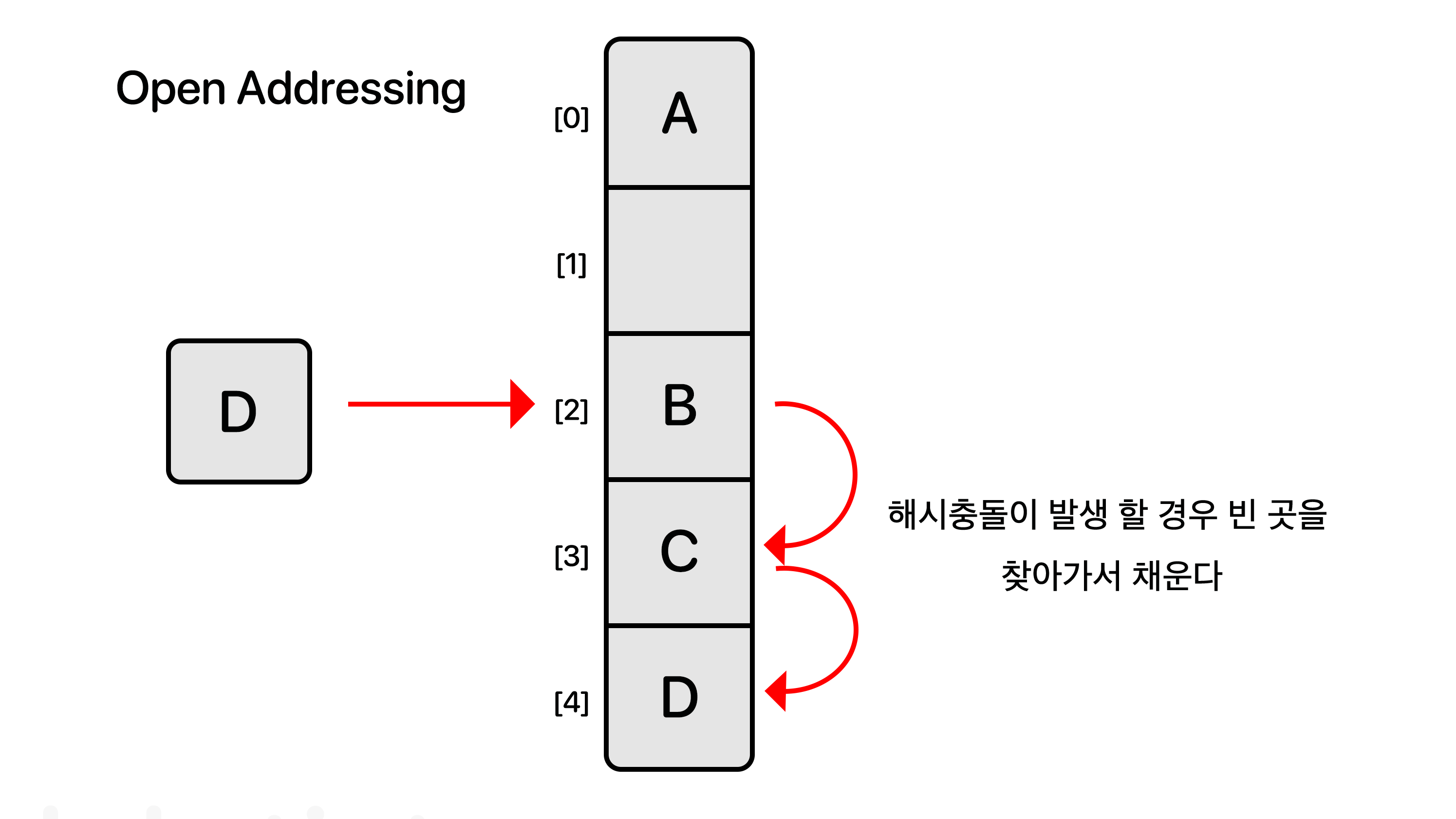 개방 주소법 (Open Addressing) 은 충돌이 발생했을 때 다른 빈 bucket을 찾아 데이터를 저장하는 방법이다.