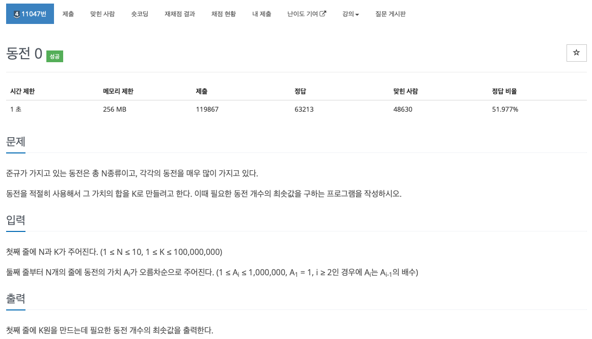 - 이때 필요한 동전 개수의 최솟값을 구해주면 된다