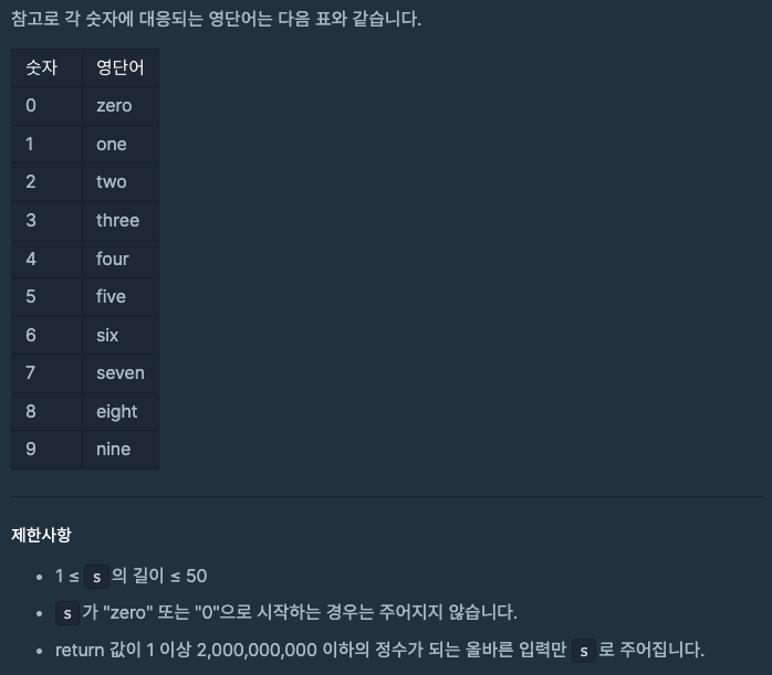 - 영단어로 된 일부 자릿수를 원래 숫자로 바꾸어 "정수"로 출력해주면 된다.