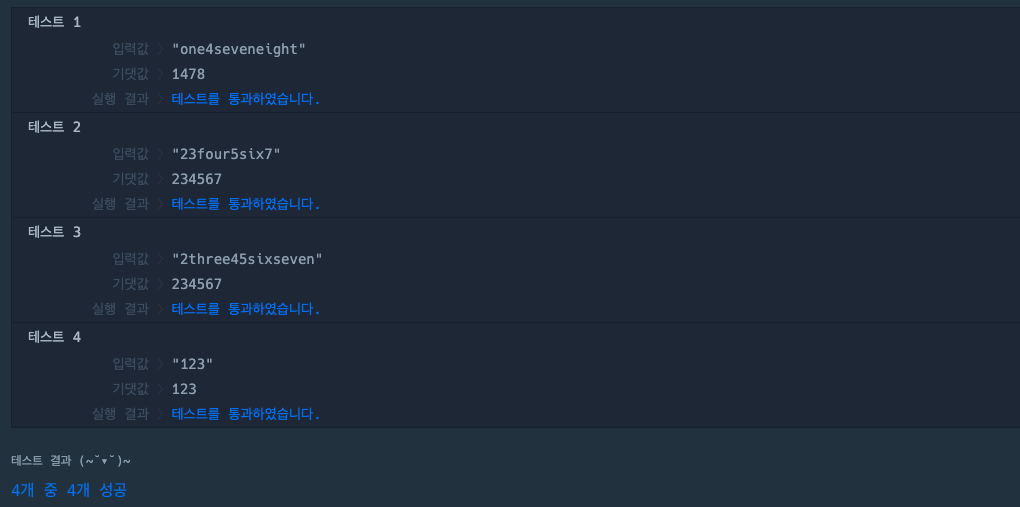 그 다음 one이 있기에 one을 기준으로 잘라주면 tmp는 ['', '4seveneight']이 되고, 요소가 2개 이상이므로 구분자 1을 기준으로 합쳐 answer에는 14seveneight가 할당된다. 그 이후 seven과 eight도 동일한 방식으로 바뀌어 최종적으로 1478이 반환된다.