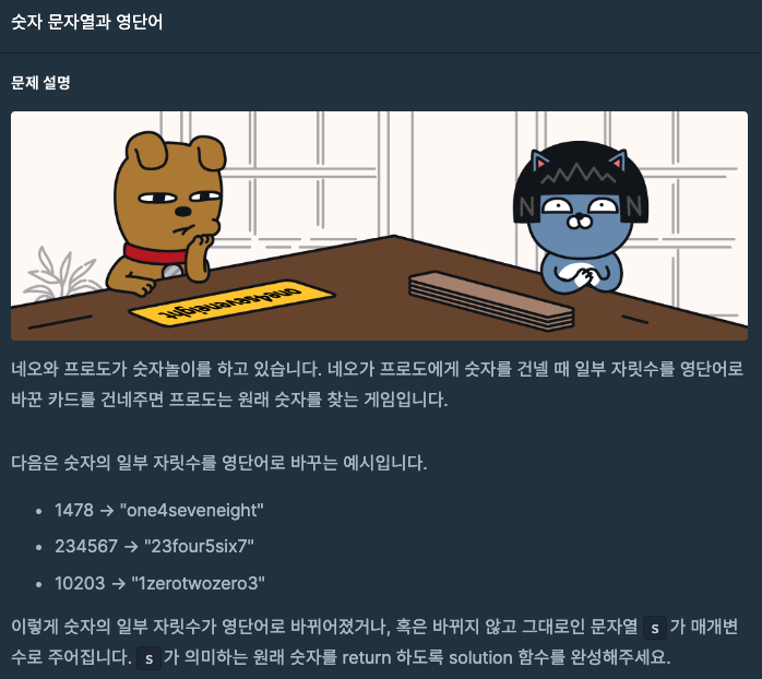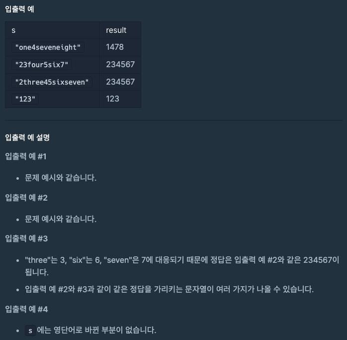- 일부 자릿수가 영단어로 되어 있는 숫자 문자열 s가 주어진다.