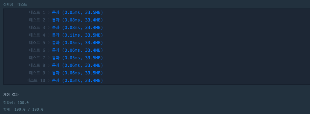실행 결과와 채점 결과는 다음과 같다.