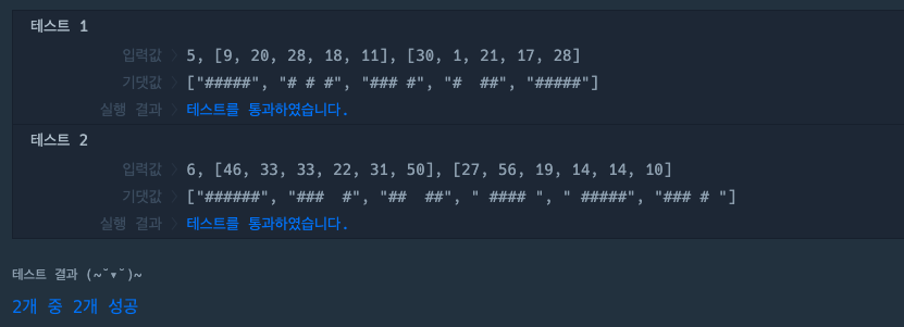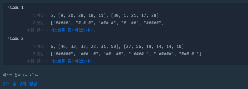 이 두 배열을 겹쳤을 때, [11111, 10101, 11101, 10011, 11111]이 되므로, 결과는 ['#####', '# # #', '### #', '# ##', '#####']이 된다.