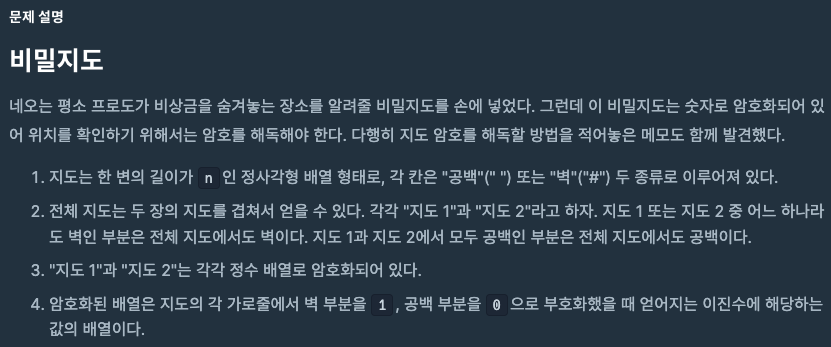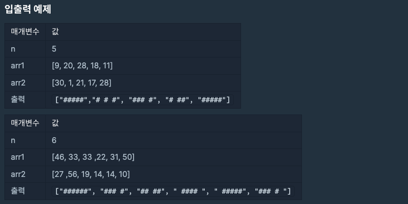 - 각 배열의 정수를 이진수로 변환했을 때, 이진수의 0과 1이 지도의 공백(" ")과 벽("#")에 대한 정보이다 - 두 지도를 겹쳤을 때