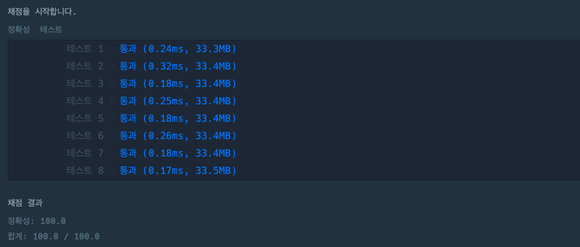 실행 결과와 채점 결과는 다음과 같다.