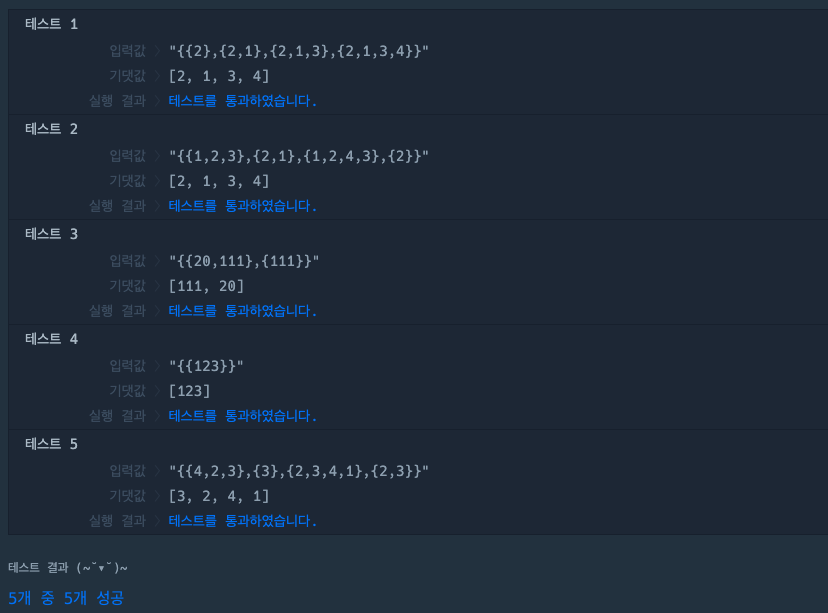 - 튜플을 표현하는 집합이 하나의 문자열 s로 주어질 때, s가 표현하는 튜플을 배열로 출력해주면 된다.