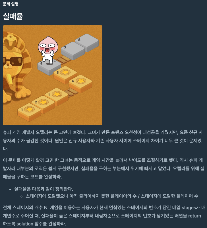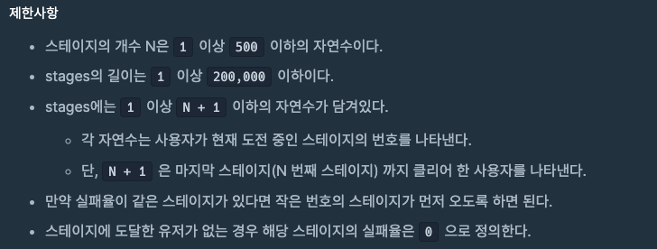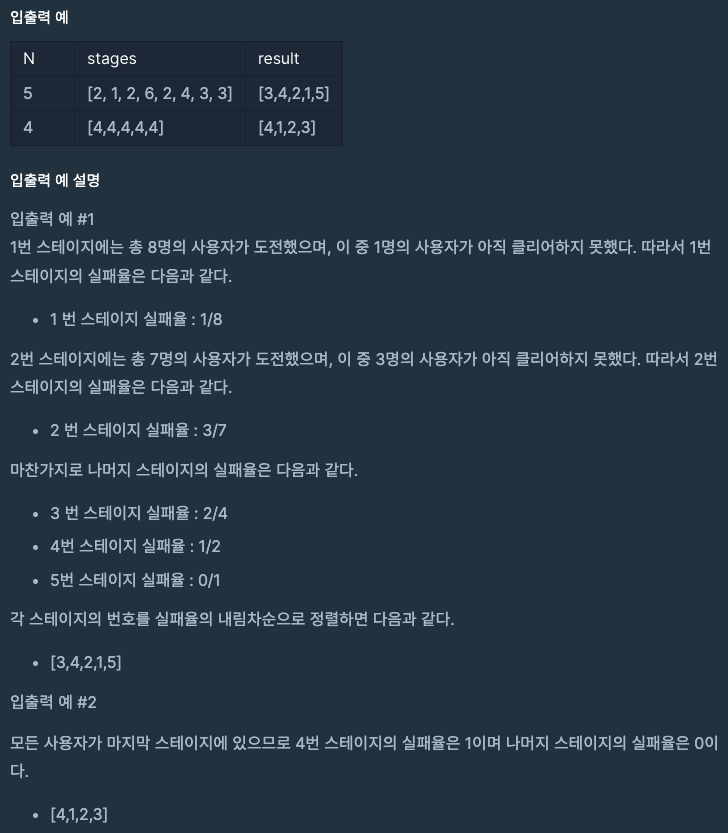 - 스테이지 수 N과 사용자들의 현재 스테이지 위치 stages(배열)가 주어질 때 실패율을 구해야 한다.