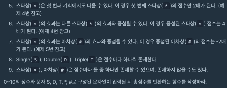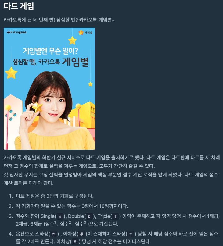 - 총 3번 다트를 던질 수 있으며, 각 기회마다 0~10점을 얻을 수 있다.