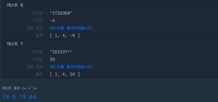 - 만약 T(3제곱)일 경우, 정수 tmp를 3제곱하여 answer에 넣어준다 - 스타상과 아차상 조건을 따져준다.