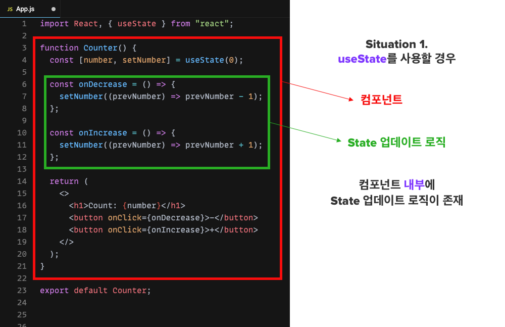 그러나 useReducer는 state를 업데이트 하는 로직을 외부로 분리시키는 것이 가능하기에, 이 로직을 별도의 파일에서 작성해 가져오는 것도 가능하다. 이로 인해 컴포넌트의 최적화를 이룰 수 있다.