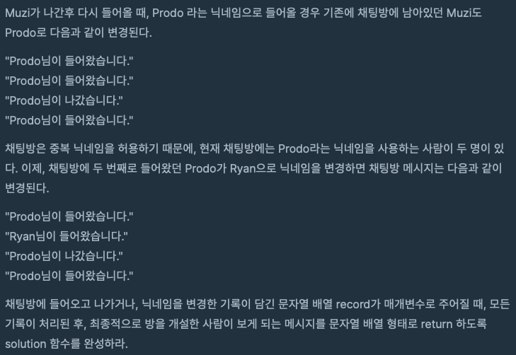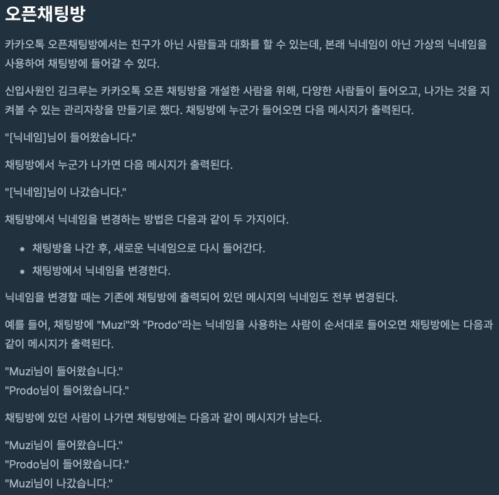 - 변경 : "Change [유저 아이디] [닉네임]" - 입장, 퇴장시 다음과 같은 메시지가 출력되며, 최종적으로 보게 될 메시지를 배열 형태로 출력해주면 된다.
